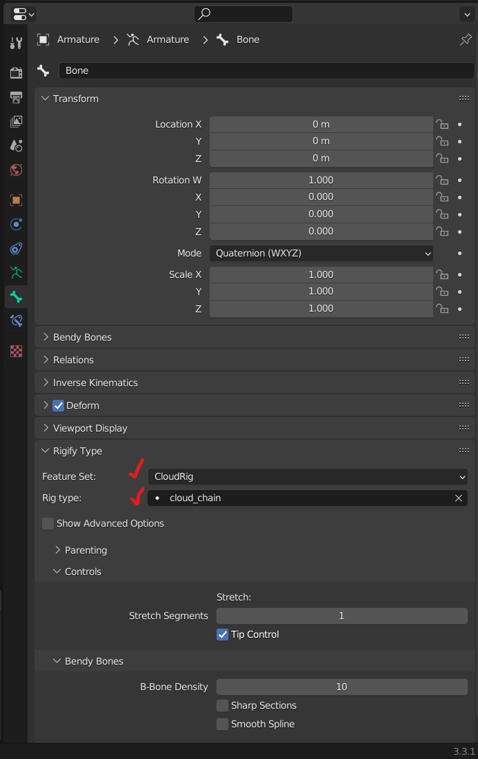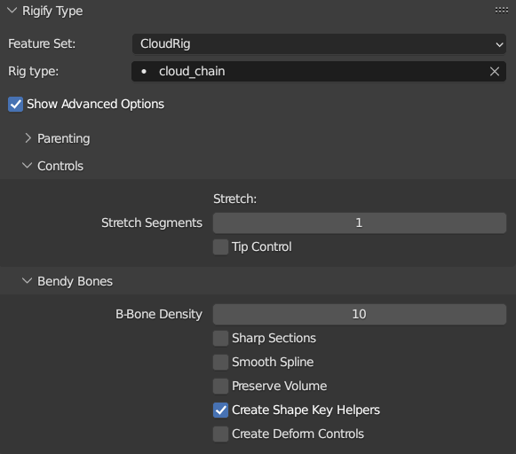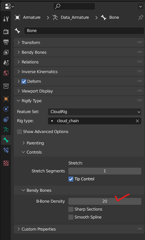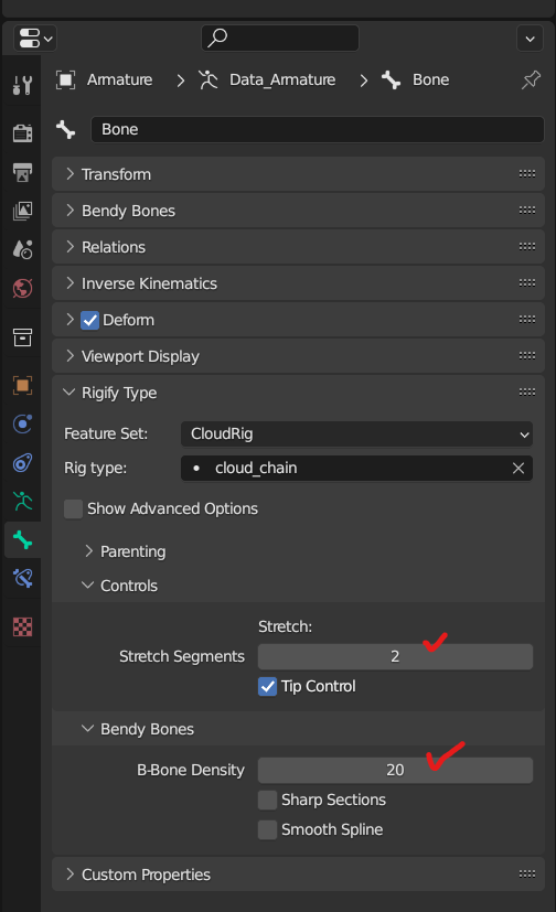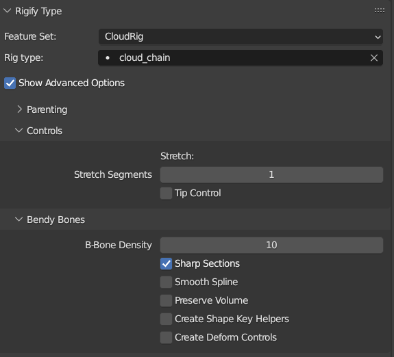 2. cloud_chian rig type 을 가진 다른 본을 생성해 tip control을 켜준다.